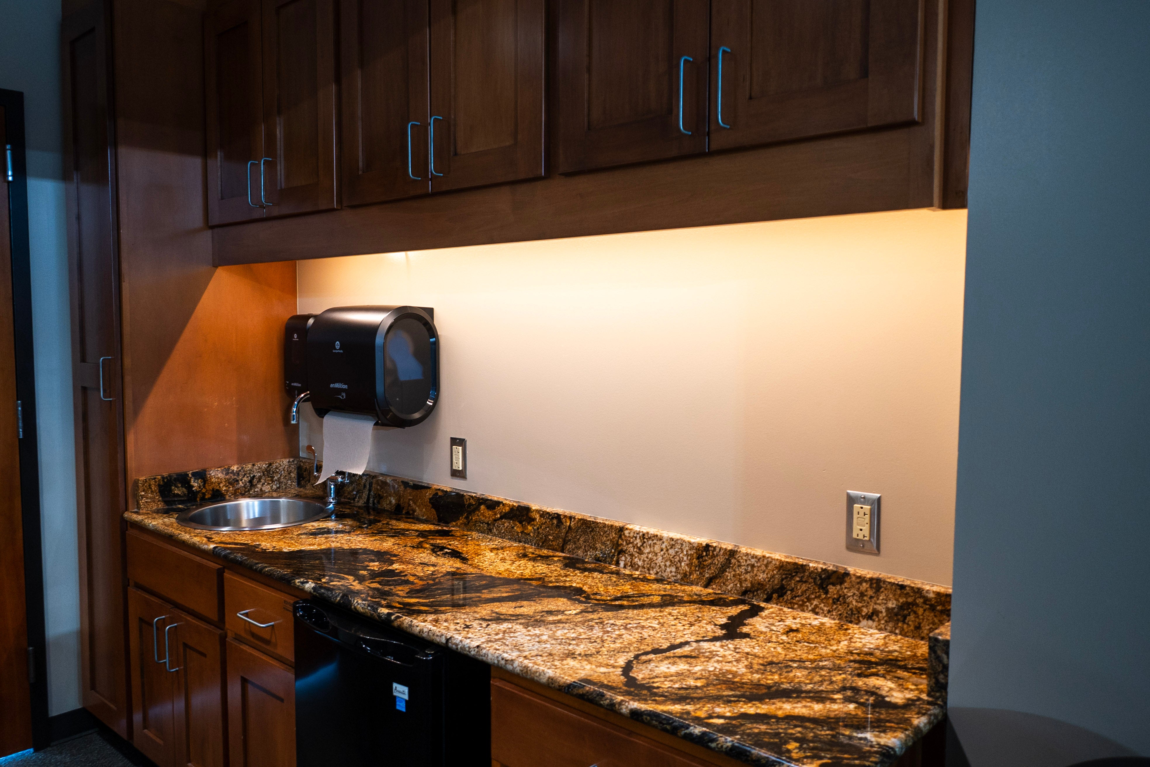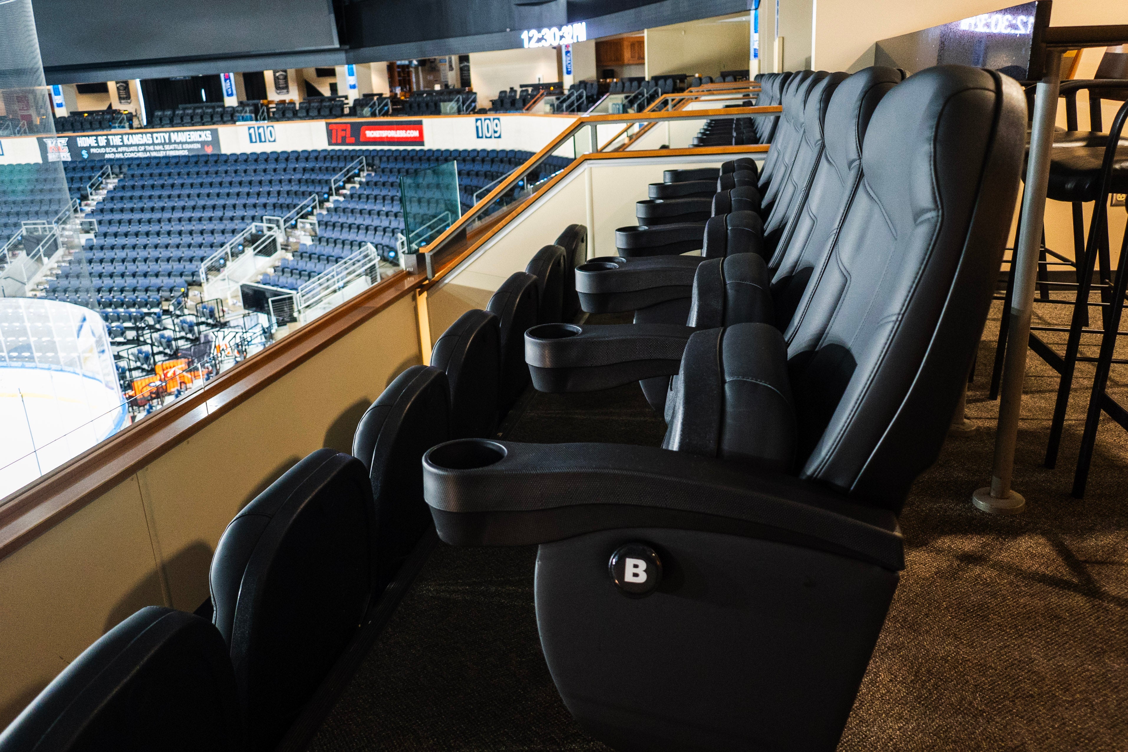 - Private suite outfitted with a wet bar, marble counters, refrigerator, flat-screen TV, and storage space